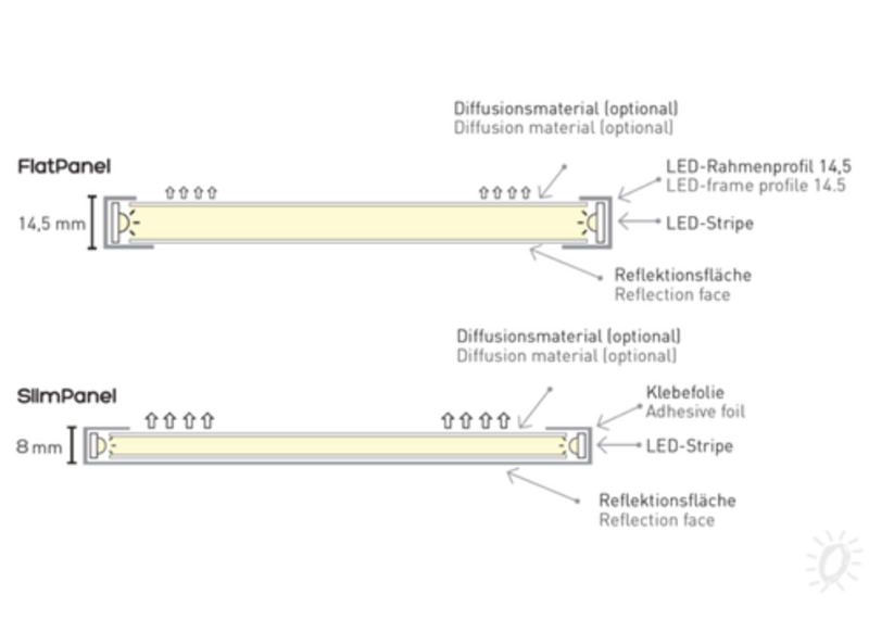 - mit Streufolie z.B. auch hinter bislang unbeleuchteten Slim-Frame Rahmen einsetzbar